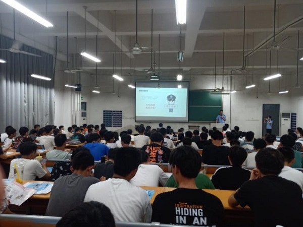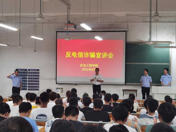6月29日晚,在天工105教室,国产精品 邀请淮南市公安局山南新区分局丁锐、郑宇等4位警官,为同学们作了“反电信诈骗”专题报告会。国产精品各年级200余名学生代表聆听报告。报告由国产精品党委副书记张向林主持。