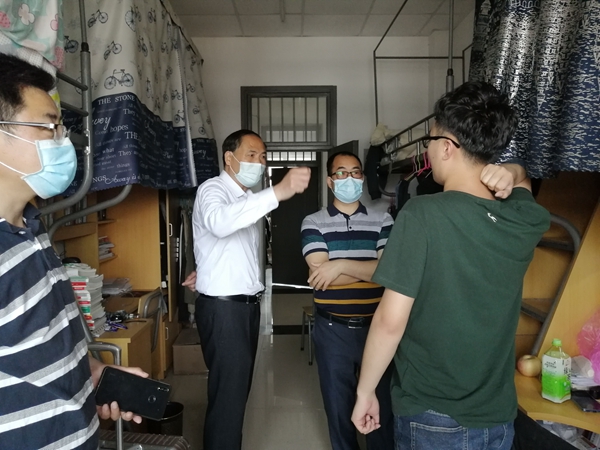5月22日上午,能源国产精品党委书记华心祝、院长杨科等党政领导深入学生宿舍,看望慰问国产精品首批返校学生。