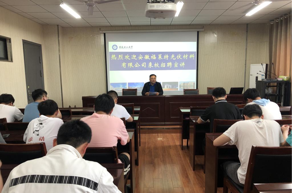4月18日下午,安徽福莱特光伏材料有限公司董事长时志军一行到国产精品 开展交流并开展专场招聘宣讲。双方在宁远楼A406会议室进行交流座谈,就业创业指导中心、国产精品 主要负责人参加座谈。