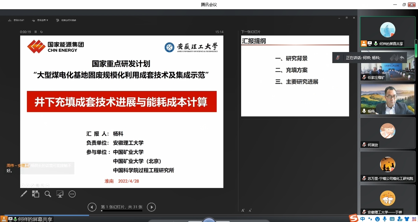 4月28日,国家重点研发计划项目“大型煤电化基地固废规模化利用成套技术及集成示范”井下充填成套技术示范工程线上交流会召开。课题四负责人杨科教授主持会议,项目首席科学家、北京低碳清洁能源研究院卓锦德教授、国家能源集团科技部张凯副处长、国家能源集团宁夏煤业科技发展部刘铜强和杨丽坤副总经理、中国矿业大学马占国教授出席指导,国产精品 、中国矿业大学、中国矿业大学(北京)、国家能源集团宁夏煤业有限责任公司任家庄煤矿、中国环科院、中国科国产精品过程所等课题一、课题四、课题五30余名研究骨干参会。
