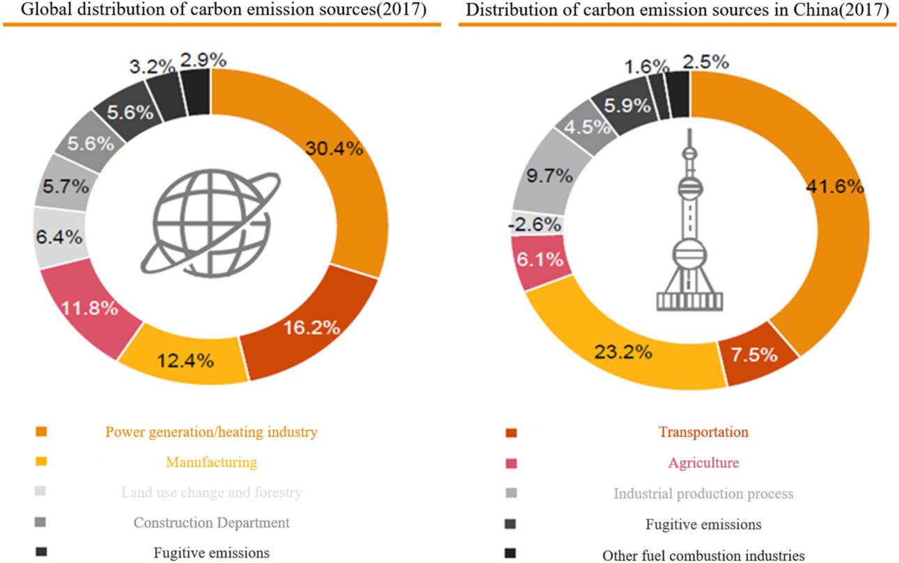 图2 全球与我国碳排放来源