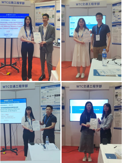 会议期间,刘贤在水泥与水泥混凝土加工、表征与性能论坛进行了《不同含水率泡沫混凝土单轴压缩声发射特征》汇报,李媛、程素娟、马凯莉在交通系统设计论坛分别进行了《GA优化BP神经网络的汽车保有量预测》、《SUMO平台下多种车辆换道模型的仿真对比分析》、《内凹聚丙烯纤维泡沫混凝土静态压缩性能》汇报。其中,刘贤和李媛的论文经大会学部委员会推选、评审,从大会收到的1868篇论文中被评选为2023世界交通运输大会优秀论文。